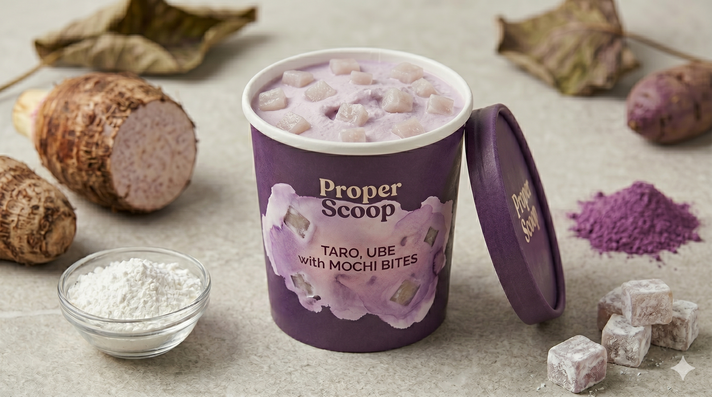 Imagine the comforting, malted nostalgia of a toasted taro, reimagined as a frozen indulgence. This scoop celebrates the earthy soul of taro, whipped into a coconut cream so thick and luxurious it feels like a silken embrace. The real magic, however, is the ube - a floral, vanilla-soaked intensity that blooms into a royal violet hue, giving a this thilling colour. Hidden within this velvety delight are tiny, hand-rolled mochi pieces; soft, elastic treasures that provide a playful "chew" with every bite. It is sophisticated, deeply satisfying, and unapologetically purple.